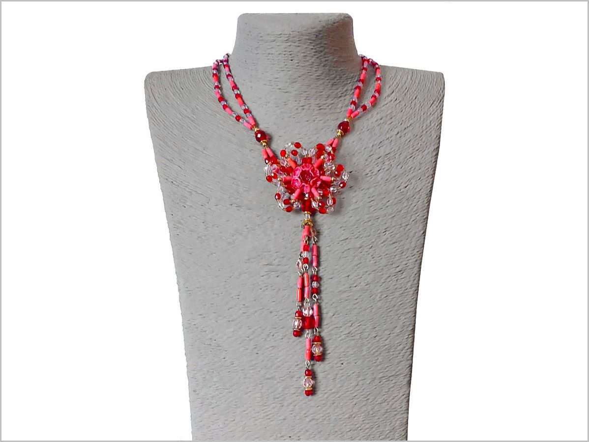 Le collier est composé de perles Conterie, facettes et Tubetti, en harmonie de rouge corail, rouge rubis et rose clair. La fleur se compose également de petites corolles rouge corail et se prolonge par trois rangs de perles en dégradé de longueur.